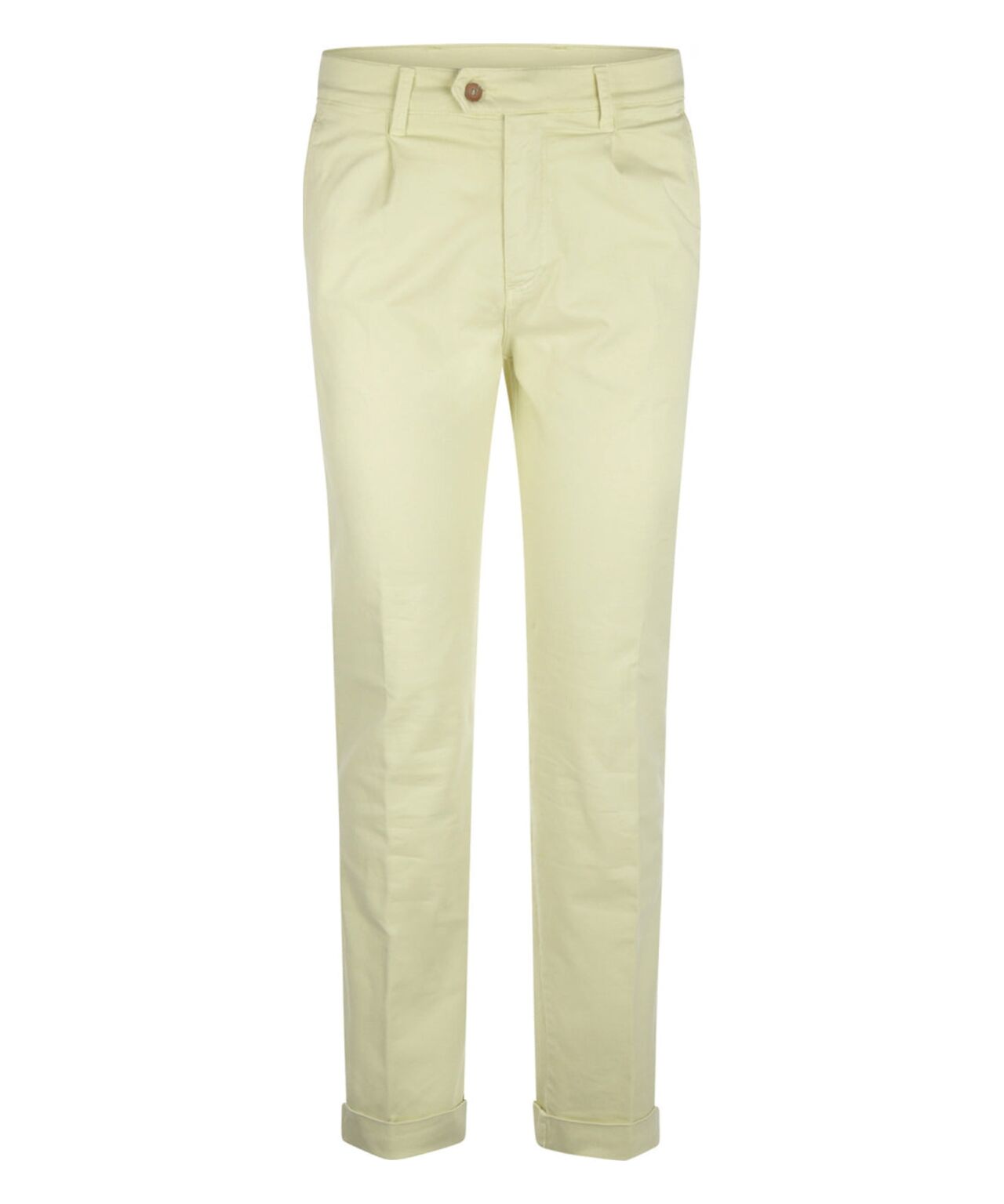 Katoenen pantalon met bandplooi en een omslag. In het katoen zit 3% elastan mee geweven zodat deze pantalon comfortabel draagt. Deze broeken worden speciaal voor The English Hatter gemaakt in Europa. De breedte van de pijp bij de omslag is 19 cm (plat gemeten).